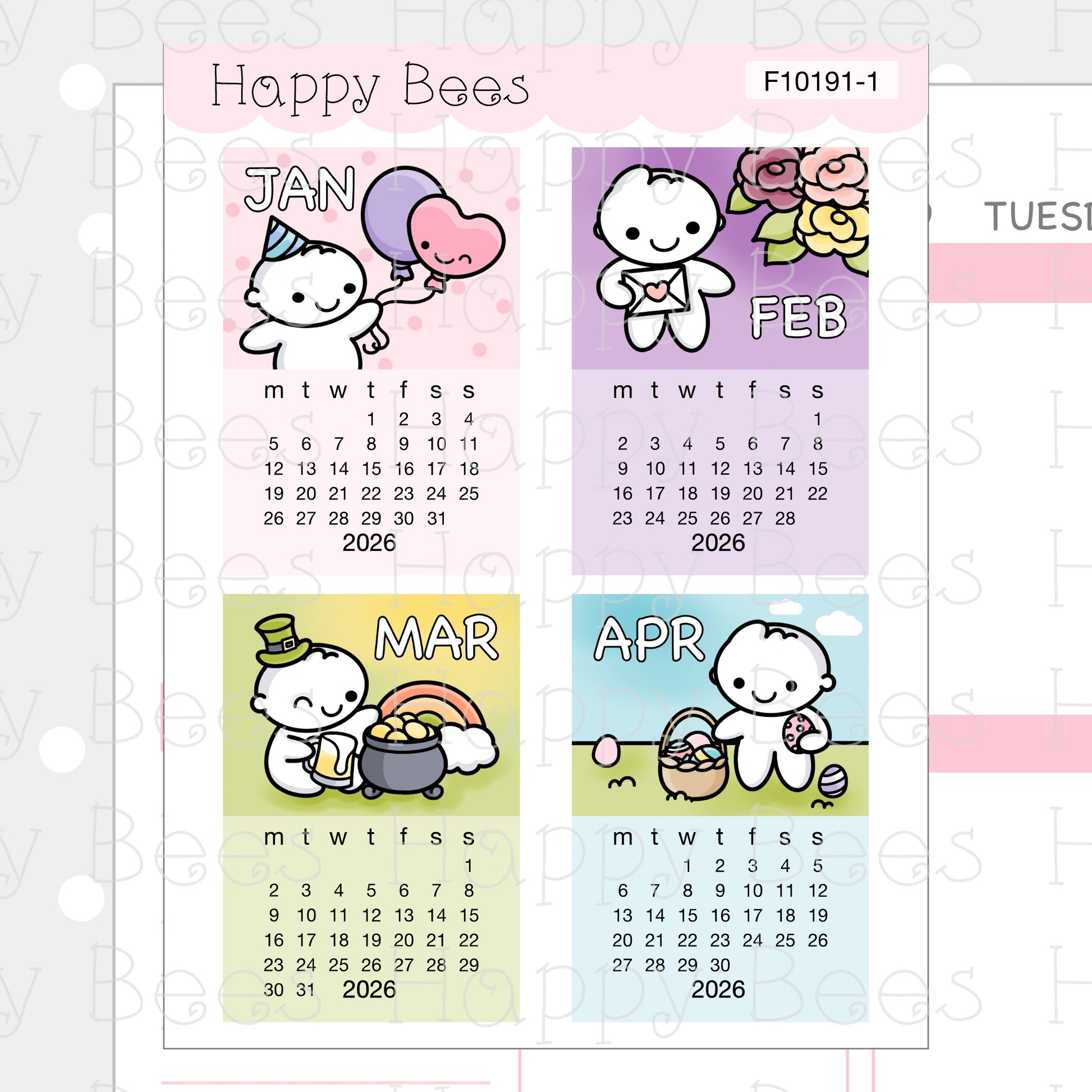 2026 Mini Calendar Doodles - Cute Functional Hobonichi Cousin Planner Stickers F10191